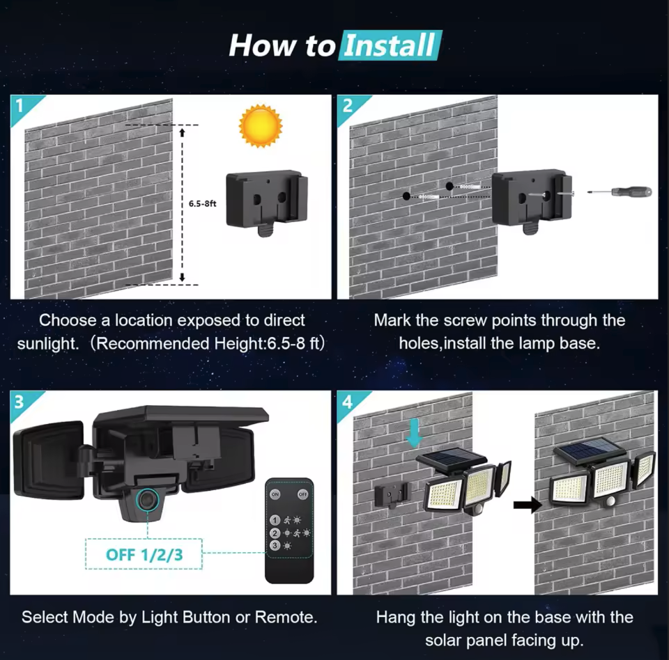 No wiring, no batteries, no maintenance! Simply mount it using the included screws and let the solar panel do the work. It’s completely wireless and eco-friendly.